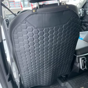 Our seat back protector features a five-layer construction with upgraded premium eco-leather on top, two layers of high-density foam, 600D Oxford, and an anti-slip rubber backing.
